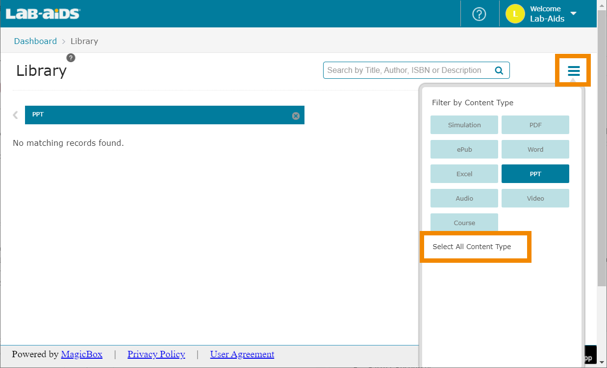 3. Once this is done, all products will display in the library. If you still do not see any content in your library after clearing your filters, please contact your admin.