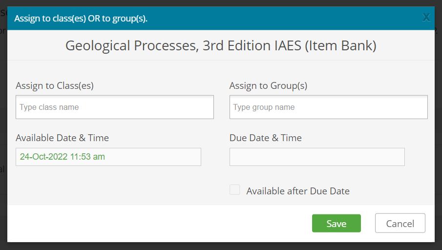 3. Next, you will be presented with a menu to choose which Classes or Groups should be assigned this assessment. Select a due date & time and select Save when done.