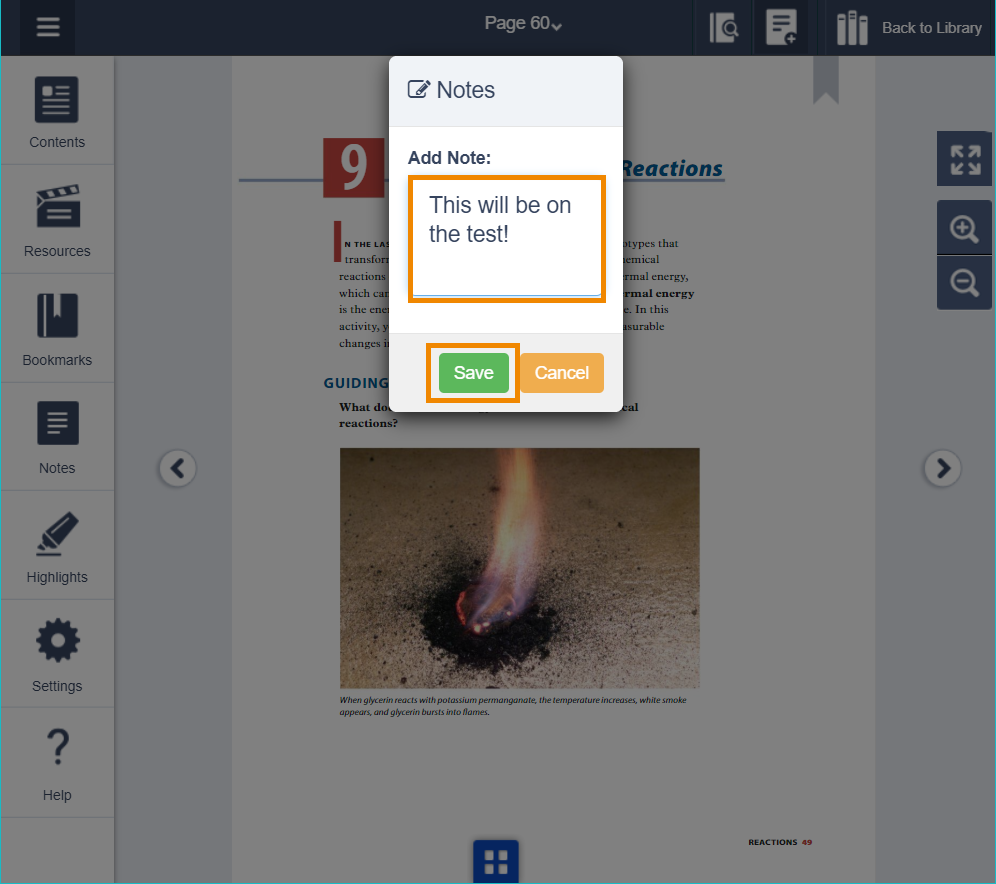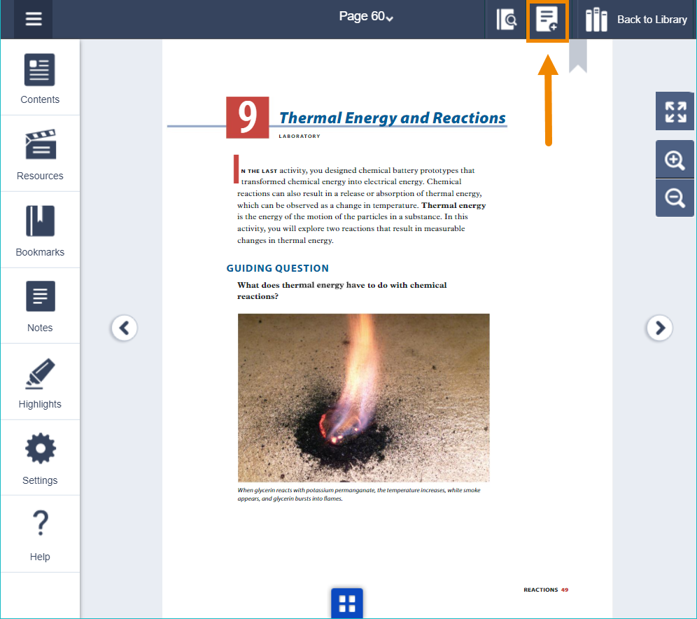1. From any page in your book, click the "notes" icon on the top right of the page.