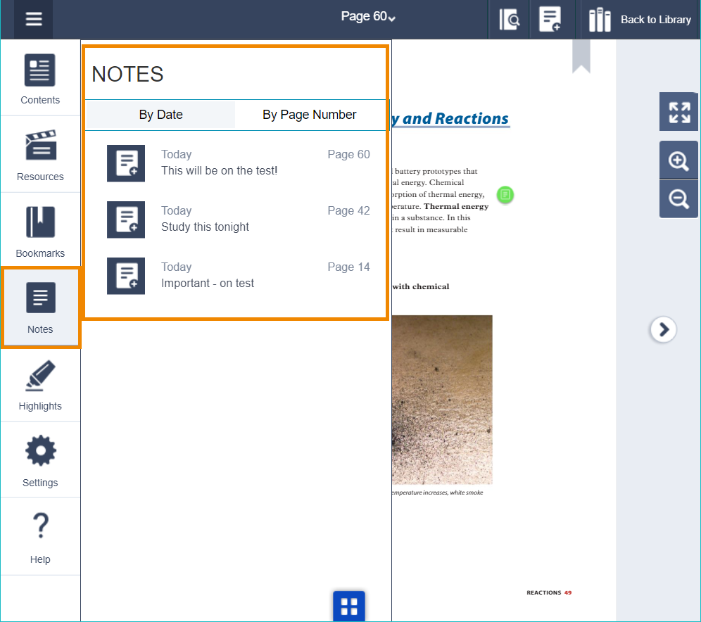 3. View all notes by clicking on the "Notes" icon on the left menu bar. You can sort notes by date entered or by page number.