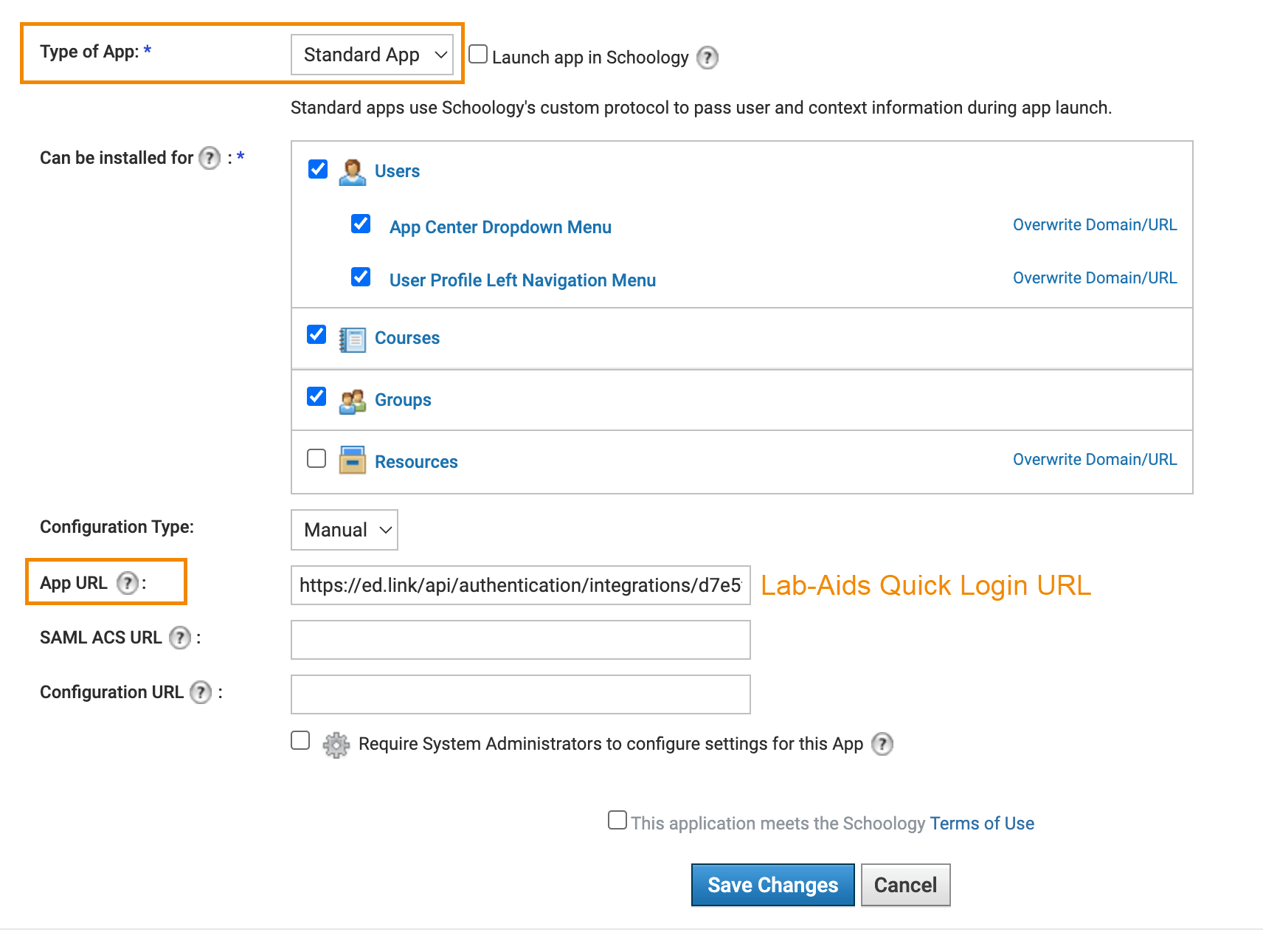 - For the App URL, enter the Lab-Aids "Quick Login URL". To find this, navigate back to your Edlink account. Click the Integrations menu option, select Lab-Aids, and copy the Quick Login URL. If you need any assistance with locating this Quick Login URL, please reach out to Lab-Aids. The format of this URL will be as follows: