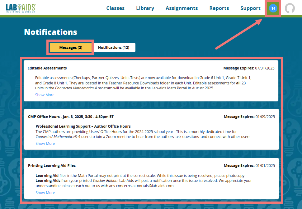- Lab-Aids Platform Announcements/Notifications: Lab-Aids will occasionally share announcements with users in the portal, including platform/content updates, office hours and support information, and other general platform communications. To view these announcements, click the circular "Notification" icon in the top right corner of your portal account.