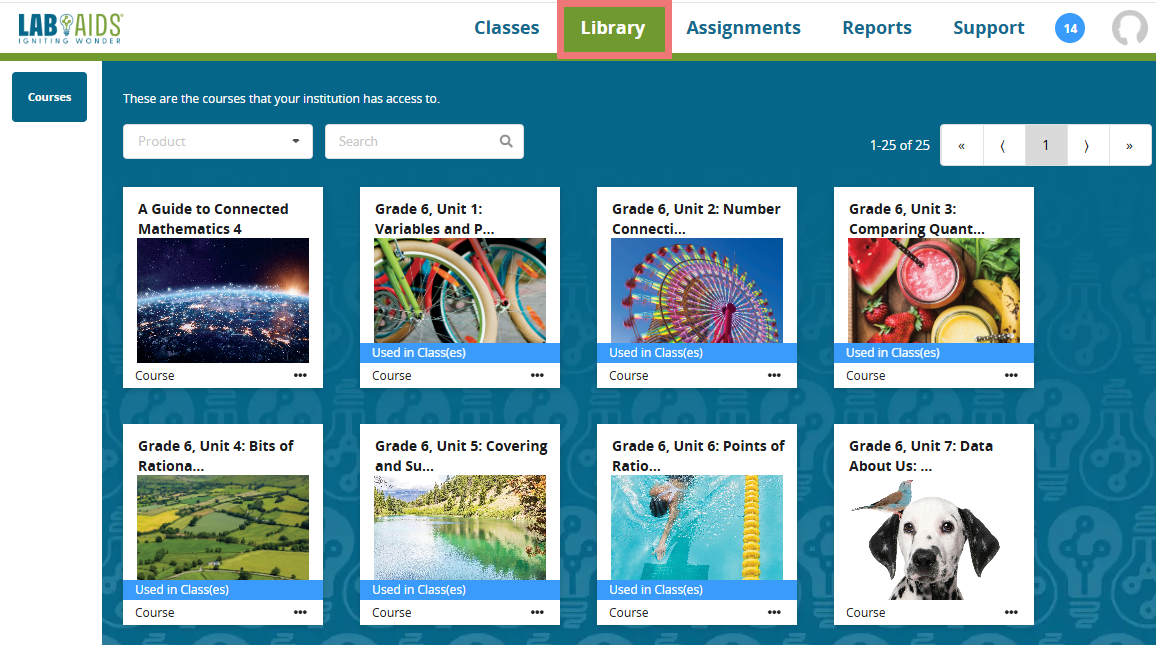 - To view course components, you can click on either the Classes >> Course or Library options.