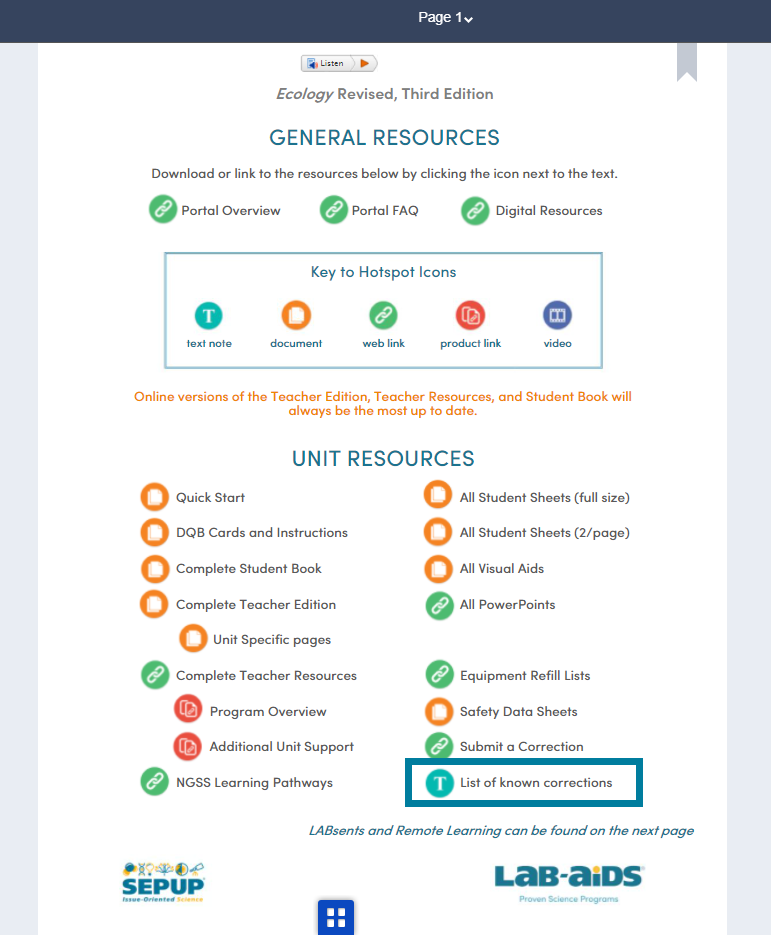 Yes, the Lab-Aids portal contains the most recent versions of Teacher Editions, Teacher Resources, and Student Books. The online versions of these books are automatically updated as corrections are made or as new content is added. This is also stated on the Tools and Resources page (page 1) of each Teacher's Edition.